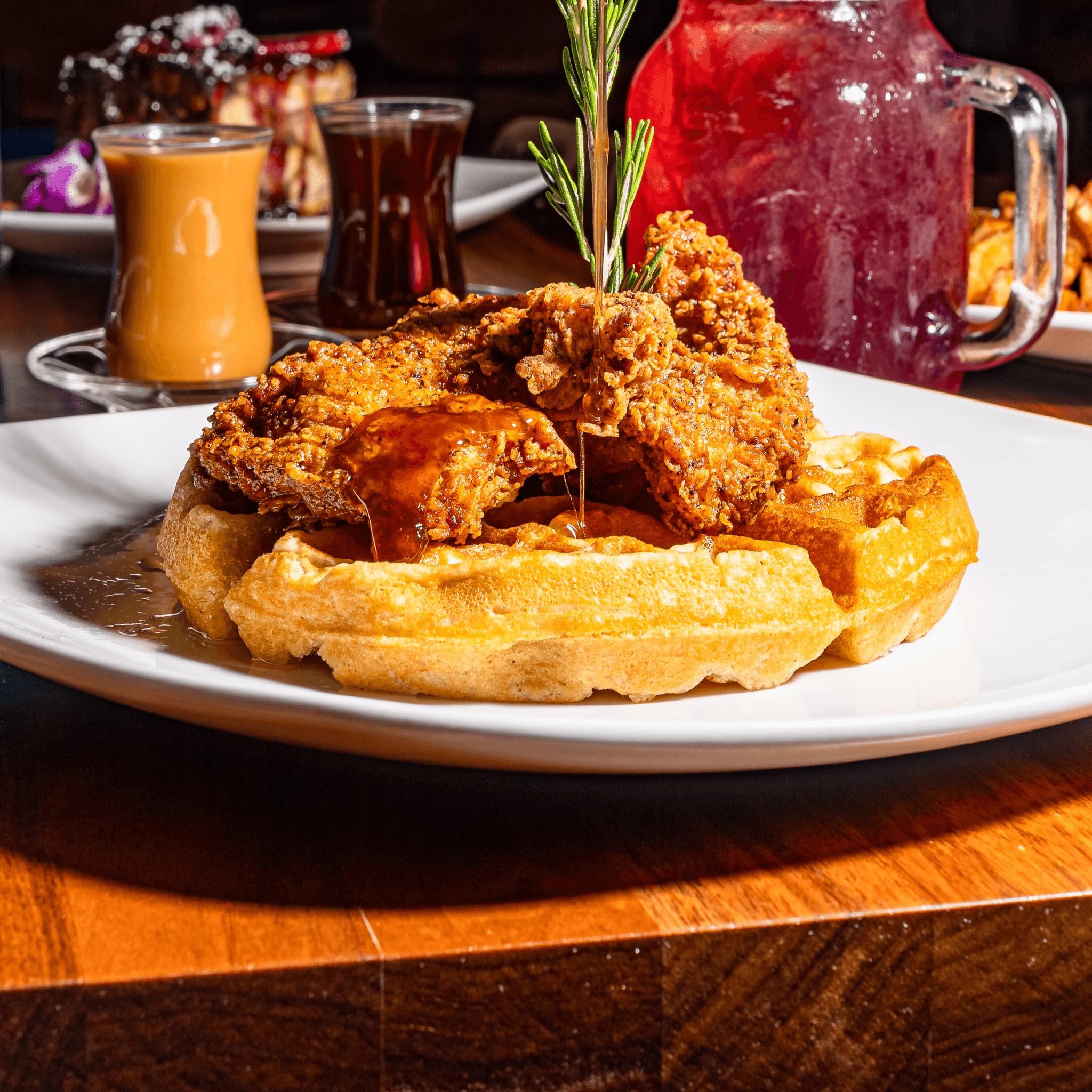 Buttermilk brined chicken, 12 spice Yemeni dredge, Melipone Vanilla, thyme infused honey butter w/Haus syrup.
