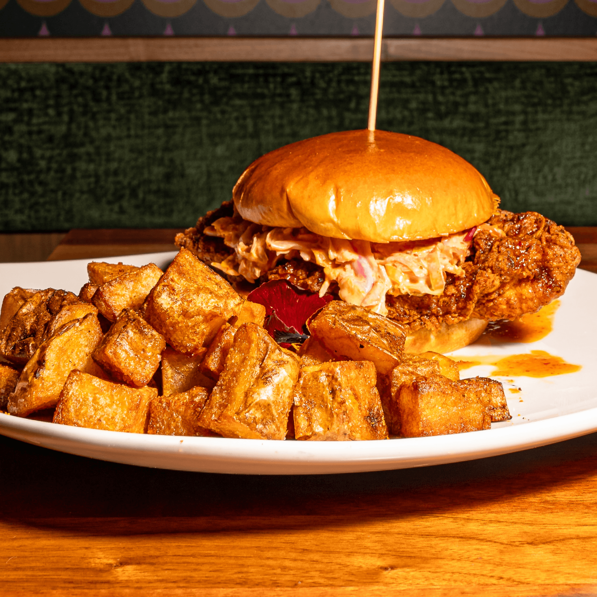 Pickle brine & then Buttermilk brined chicken breast, Yemeni 12 spice flour dredge, Gochujang Honey Glaze, Louisiana style Slaw on a brioche bun.