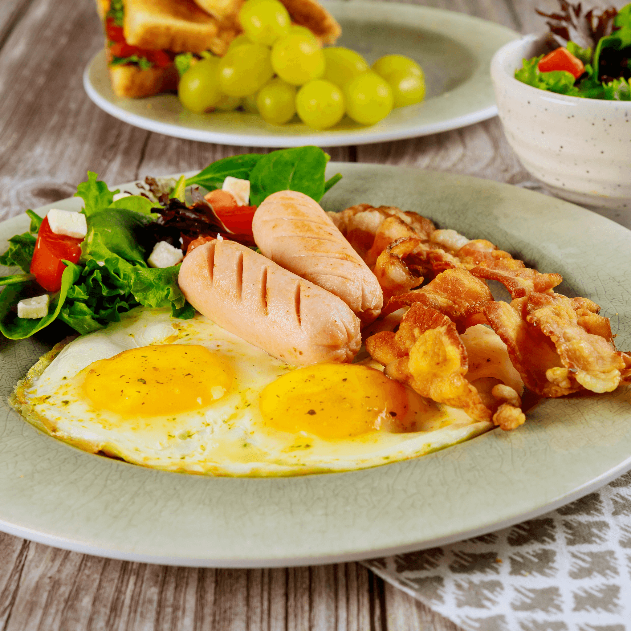 Two eggs, haus potatoes, choice of beef bacon, turkey bacon, or chicken sausage & toast