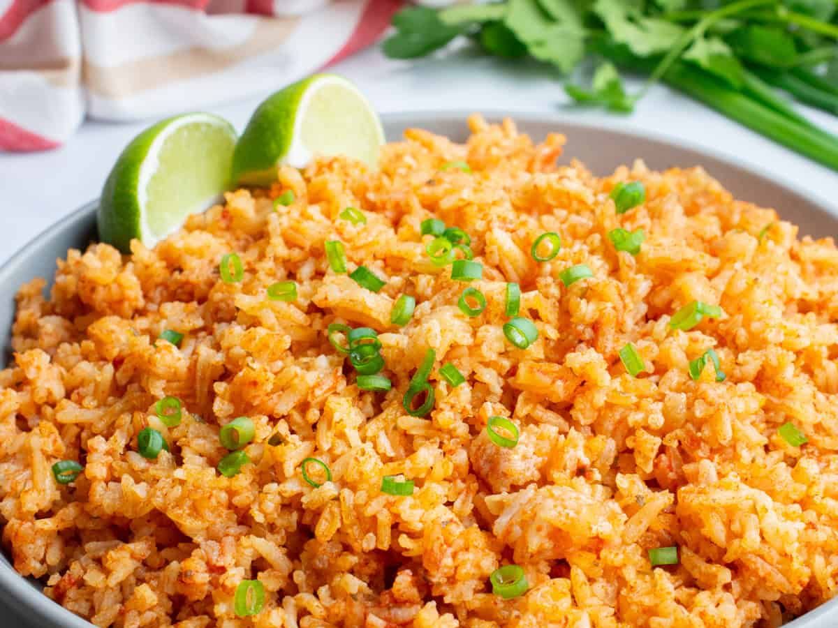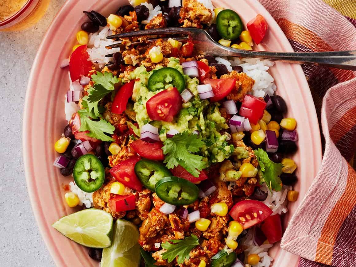 Spanish Rice topped with smoky chipotle chicken, Spanish rice, black beans, sweet corn, fresh pico de gallo, and a dollop of sour cream.