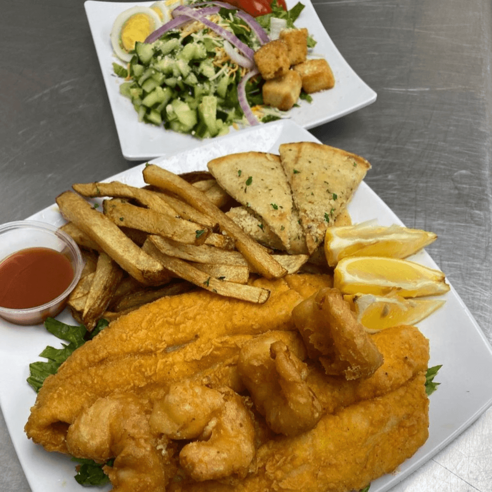 2 pieces of Swai fish, fries, side salad, and urban bread
