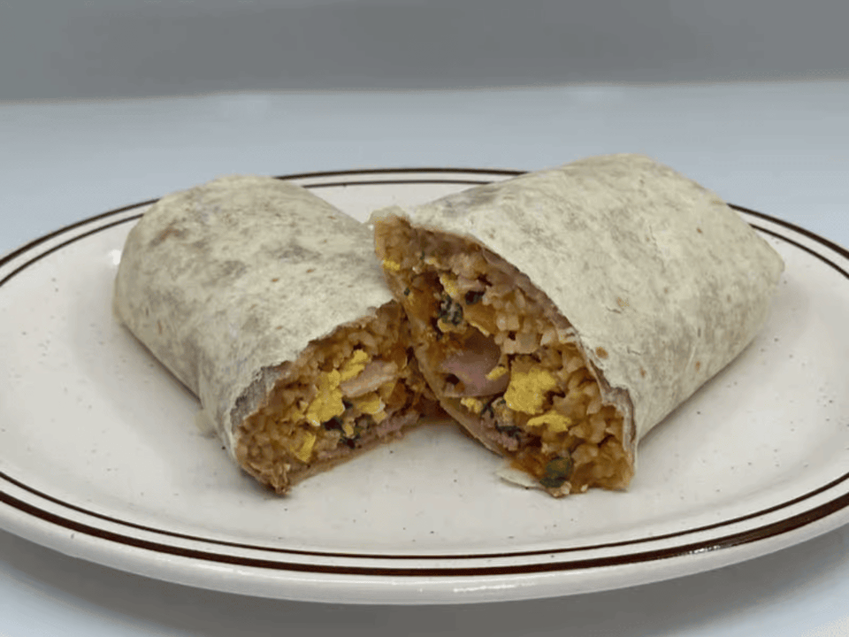 Ham, onions, green pepper, and cheese. Omelettes are made with 2 large eggs, served with hashbrowns and toast.