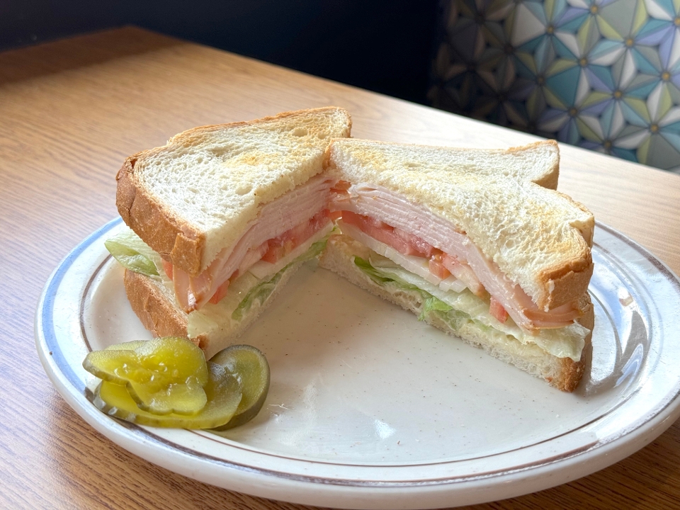 Your choice of bread served hot or cold sandwiched together with turkey, mayonnaise, tomato, lettuce, onions, and served with pickles on the side.