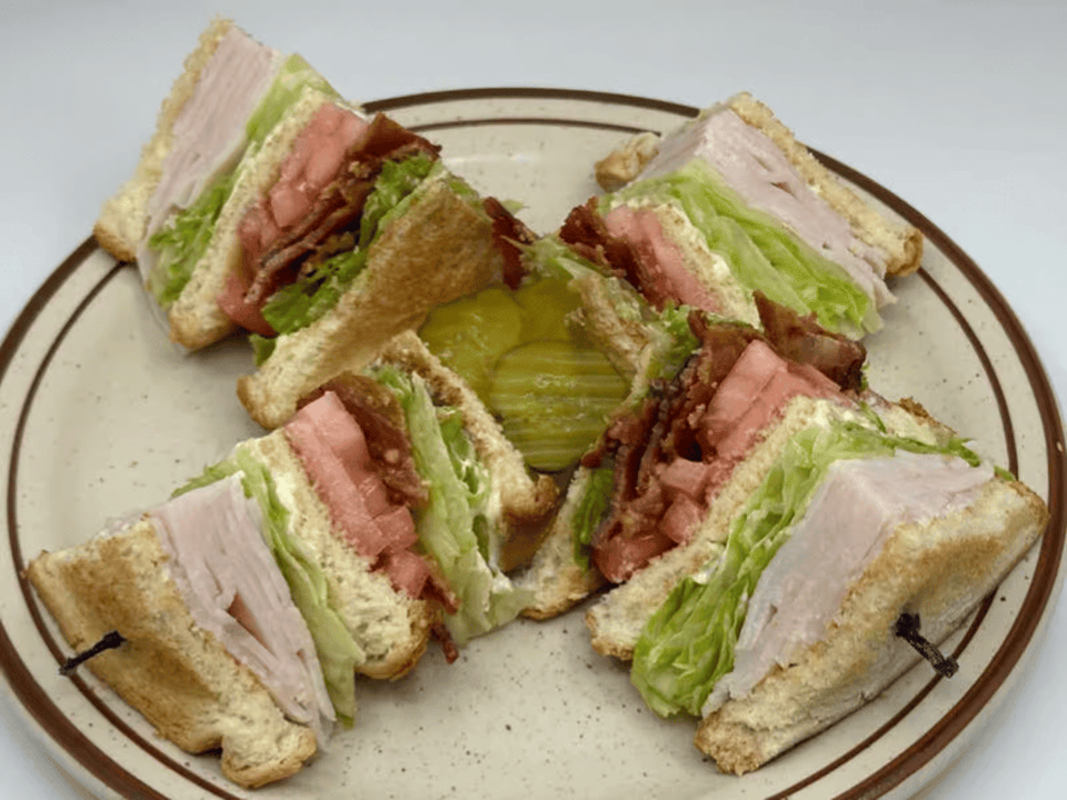 Tripe decker with bacon, turkey, lettuce, tomato, pickles, and mayonnaise.